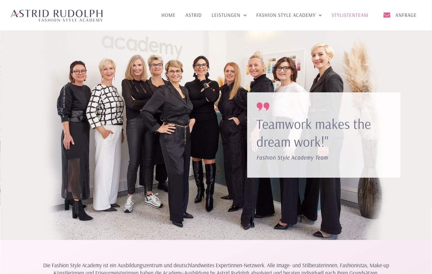 Seit mehr als 20 Jahren bilden Astrid Rudolph und ihr Team interessierte, motivierte Menschen in den Bereichen Fashion Styling, Personal Styling & Shopping, Make-up- und Friseurhandwerk aus. Viele kommen aus dem Modedesign oder Einzelhandel, sind Ladenbesitzer:innen oder arbeiten in der Kosmetik- und Friseurbranche.