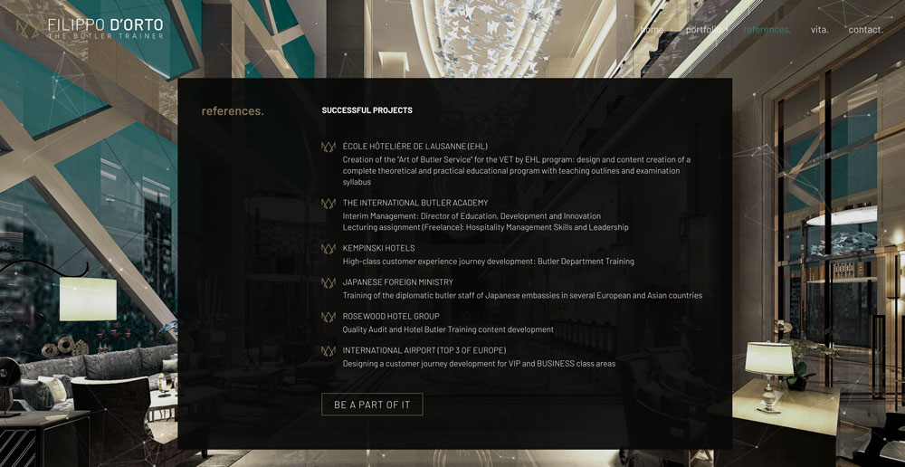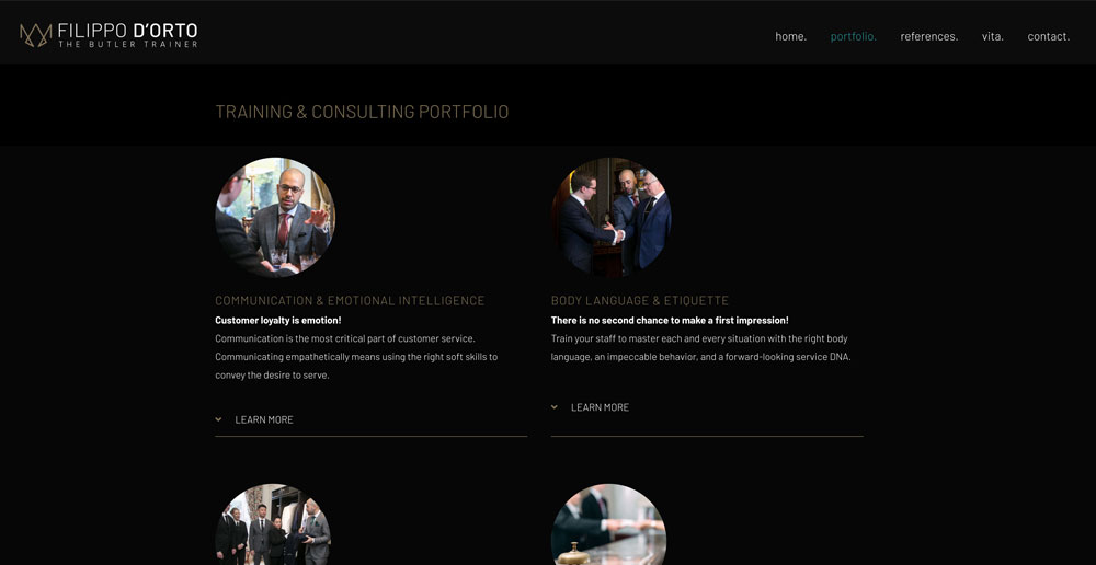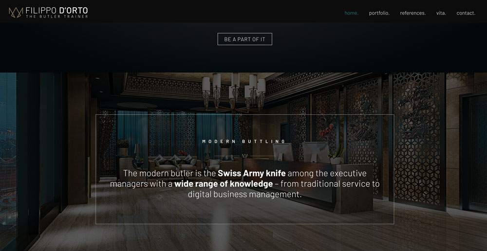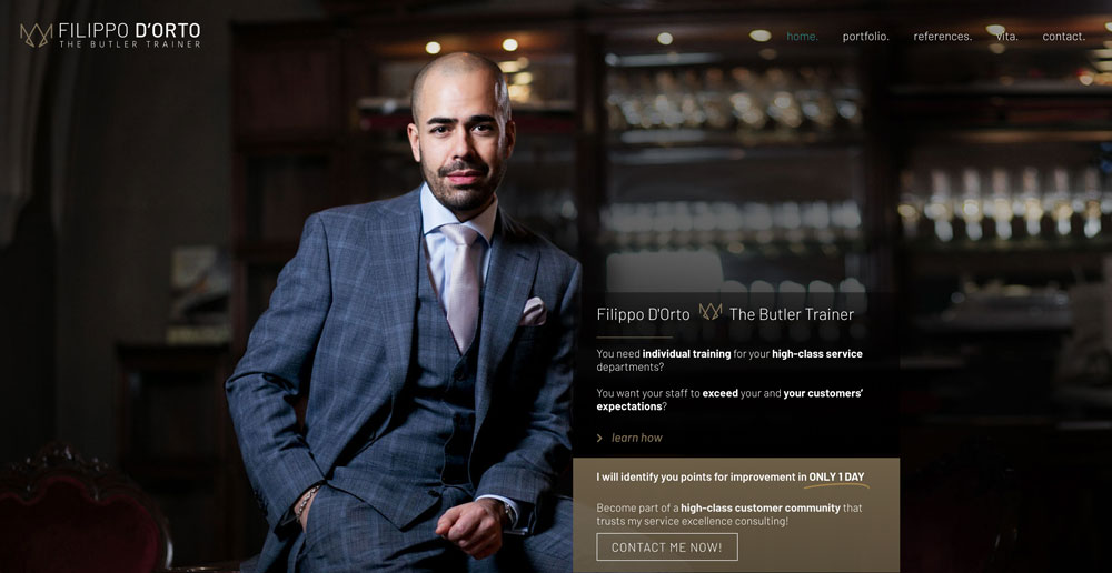 Filippo D’Orto ist ein etablierter Berater und Trainer für hochwertige Service-Erlebnisse in der Hotellerie und im Premium-Service-Bereich. Die Webseite stellt sein Referenzen und seine Persönlichkeit vor.