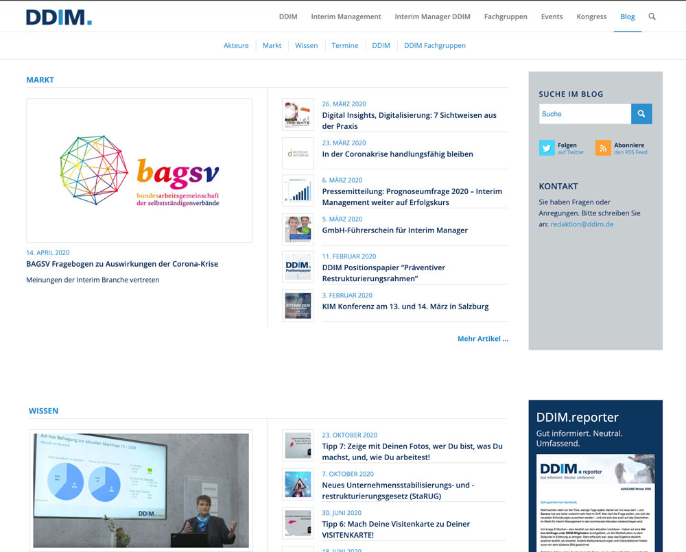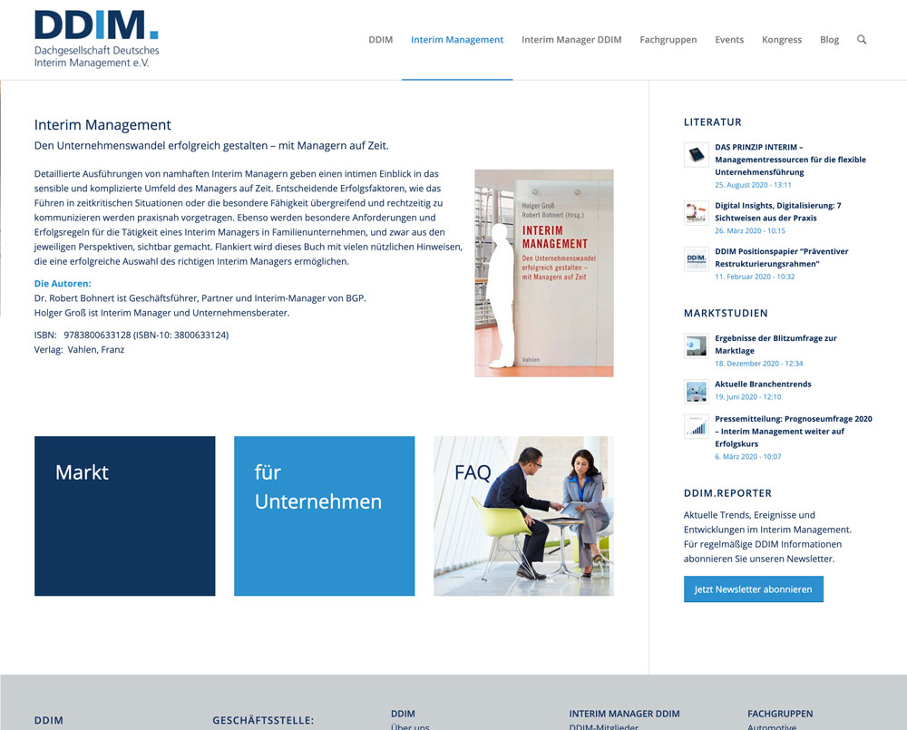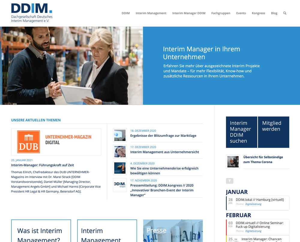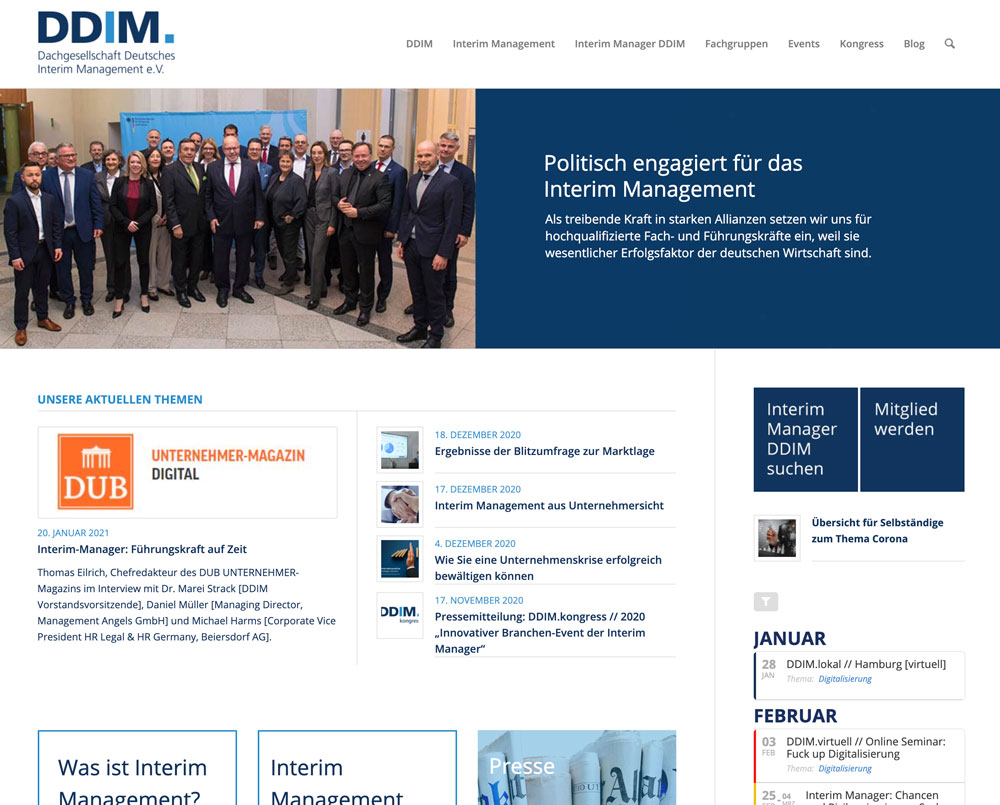 Die DDIM engagiert sich für das beständige Wachstum der Interim Management Branche und hat sich zum Ziel gesetzt, das Verständnis und das Ansehen des professionellen Interim Managements durch konsistente und kontinuierliche Verbandskommunikation zu fördern. Die DDIM bündelt und koordiniert alle wichtigen Kommunikationsmaßnahmen der Interim Management Branche und versorgt Wirtschaft, Politik und Öffentlichkeit als kompetenter und unabhängiger Ansprechpartner mit aktuellen Informationen. Die Webseite ist ein wichtiger kommunikativer Hebel für dieses Ziel.