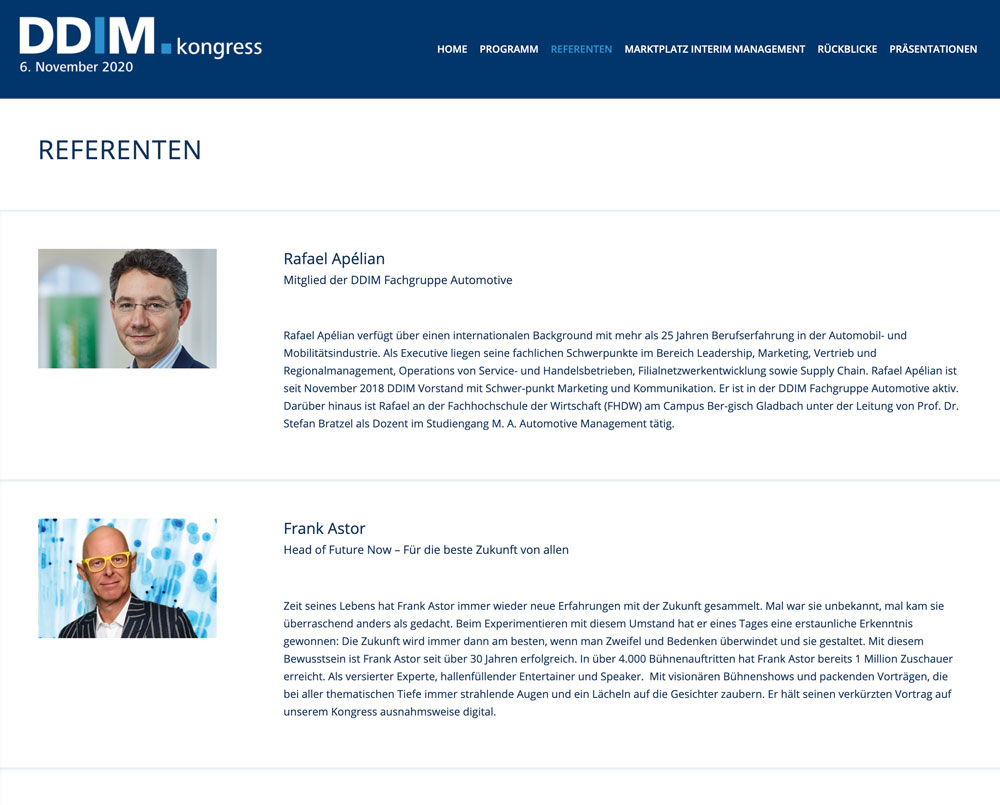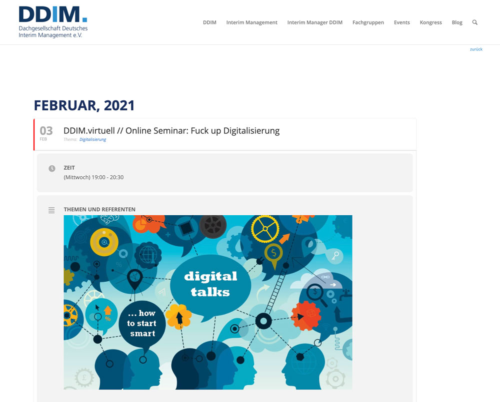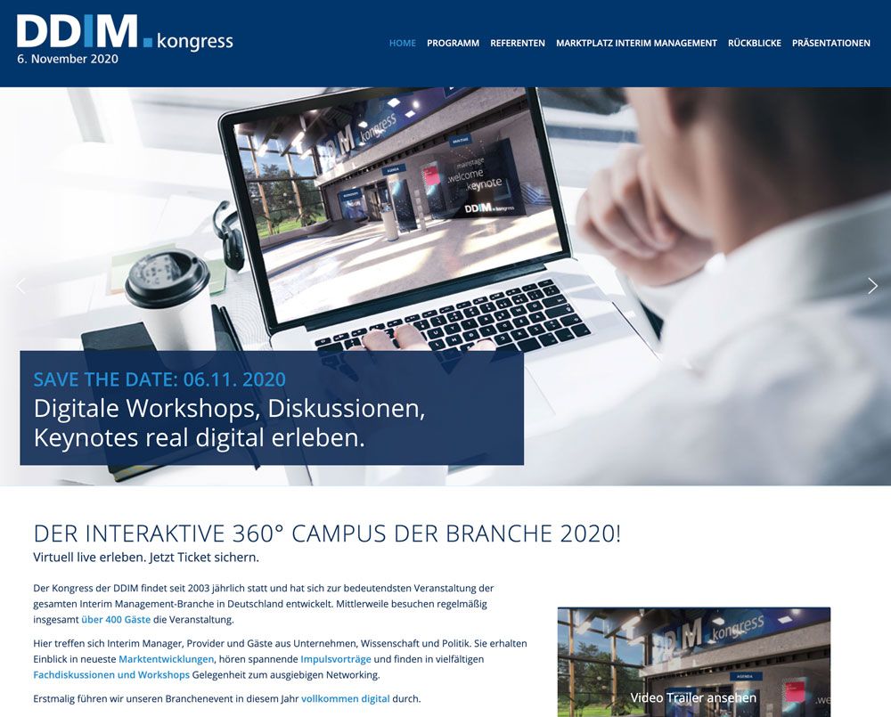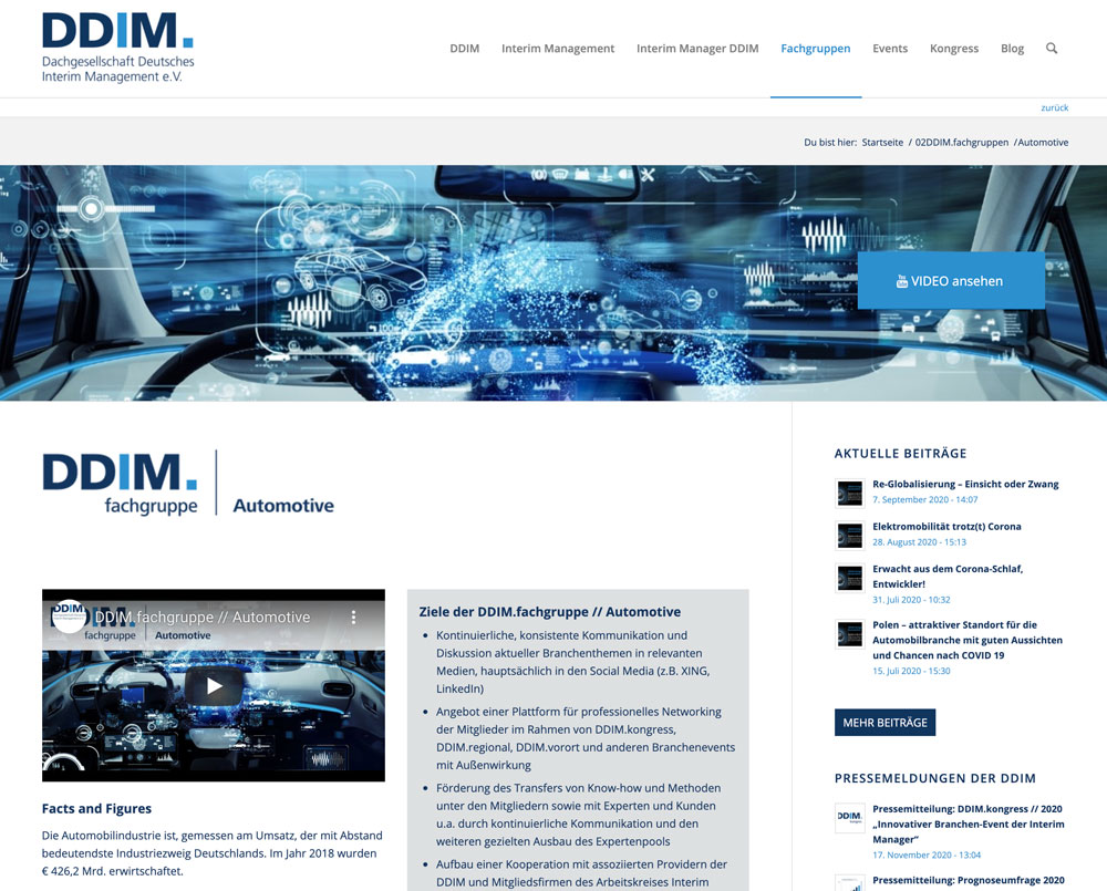Die DDIM engagiert sich für das beständige Wachstum der Interim Management Branche und hat sich zum Ziel gesetzt, das Verständnis und das Ansehen des professionellen Interim Managements durch konsistente und kontinuierliche Verbandskommunikation zu fördern. Die DDIM bündelt und koordiniert alle wichtigen Kommunikationsmaßnahmen der Interim Management Branche und versorgt Wirtschaft, Politik und Öffentlichkeit als kompetenter und unabhängiger Ansprechpartner mit aktuellen Informationen. Die Webseite ist ein wichtiger kommunikativer Hebel für dieses Ziel.