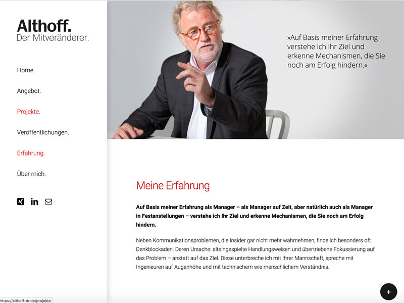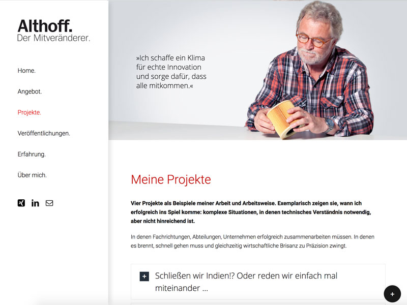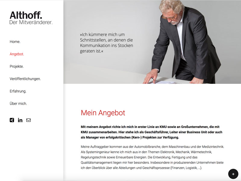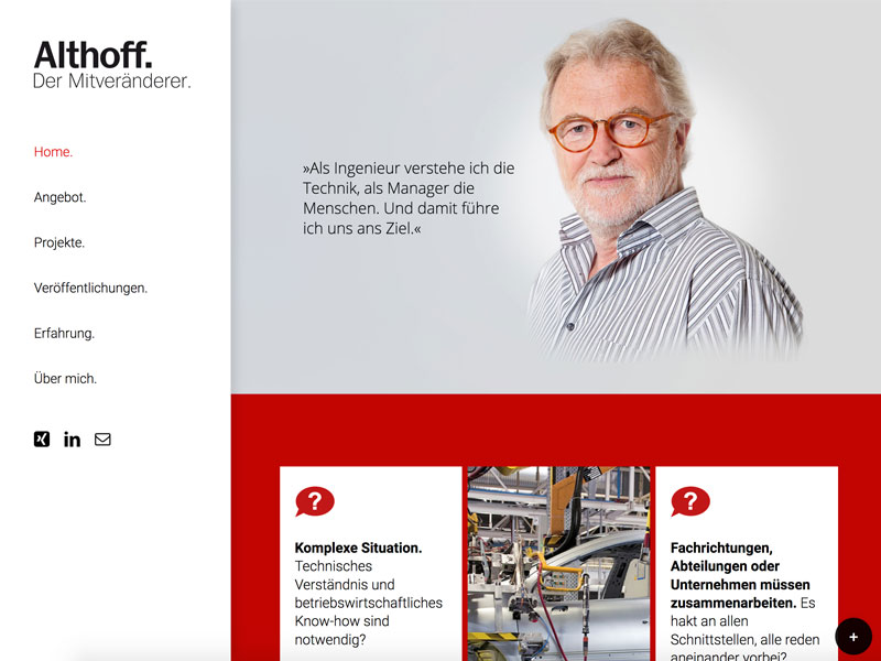 Althoffs Kunden kommen aus der Industrie. Sie beauftragen ihn als Interim Manager, um schnell ein gewünschtes Ergebnis zu erzielen. Gefragt ist er dann, wenn tiefes technisches Verständnis und absolute Kommunikationsfähigkeit gefragt sind.