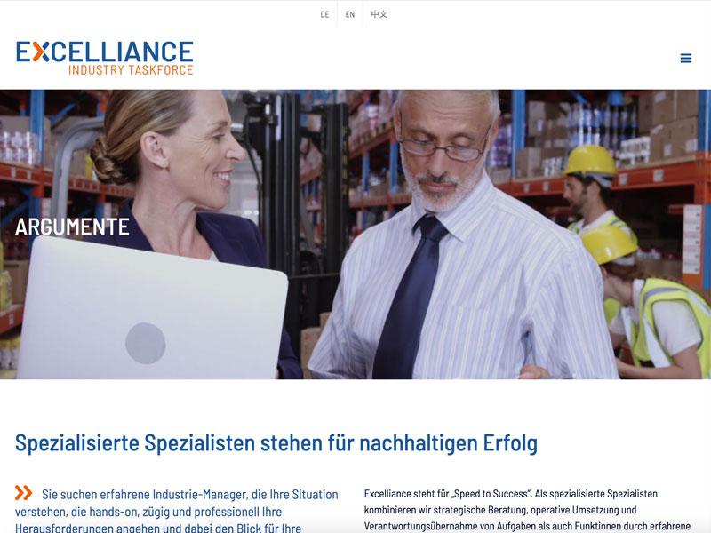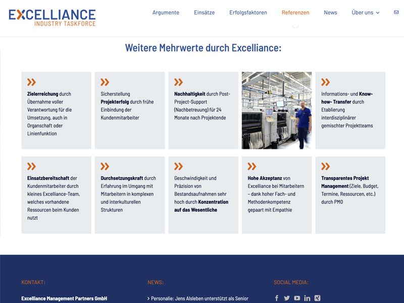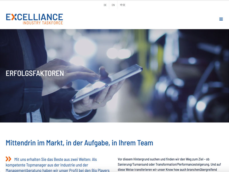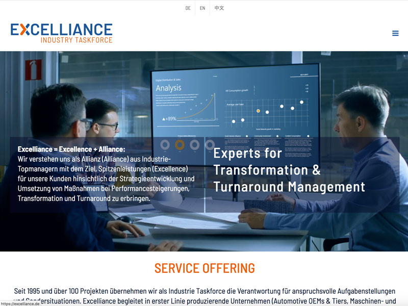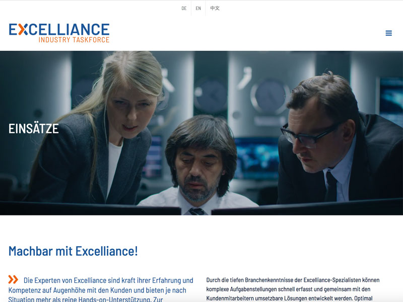 Excelliance übernimmt als Industrie Taskforce die Verantwortung für anspruchsvolle Aufgabenstellungen und Sondersituationen. Excelliance begleitet in erster Linie produzierende Unternehmen mit einem umsetzungsstarken Team von aktuell über 50 handverlesenen Experten. Diese Experten und deren Arbeitsweise und Erfahrung werden auf der Homepage vorgestellt.