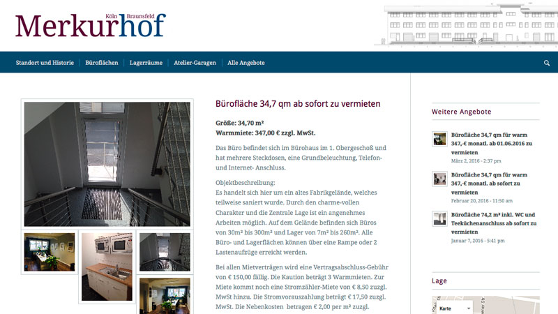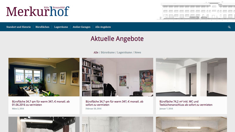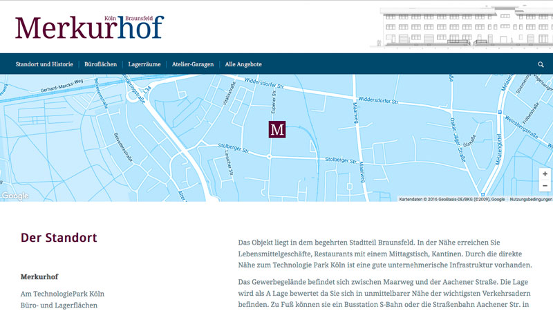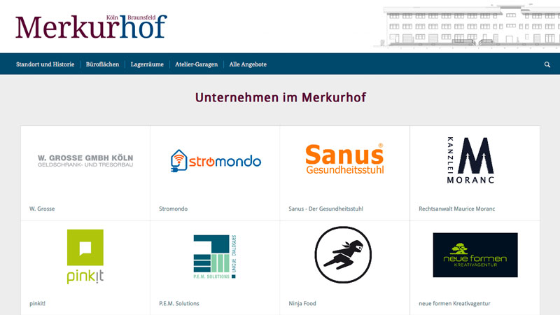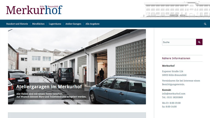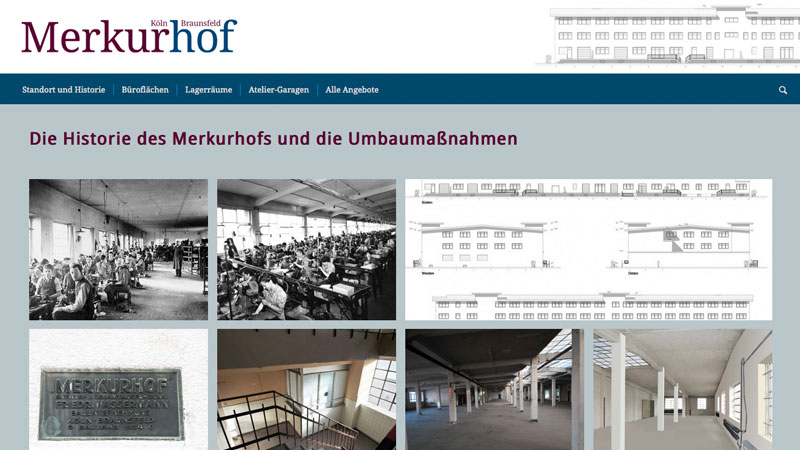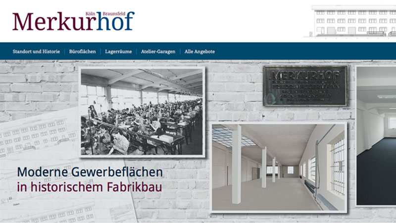 Der Merkurhof in Köln Braunsfeld bietet Büro und Gewerberäume in einem historischen Fabrikgebäude. Das Portal vermarktet einserseits freie Flächen, andereseits bietet es auch eine darstellungsplatform für ansässige Unternehmen.
